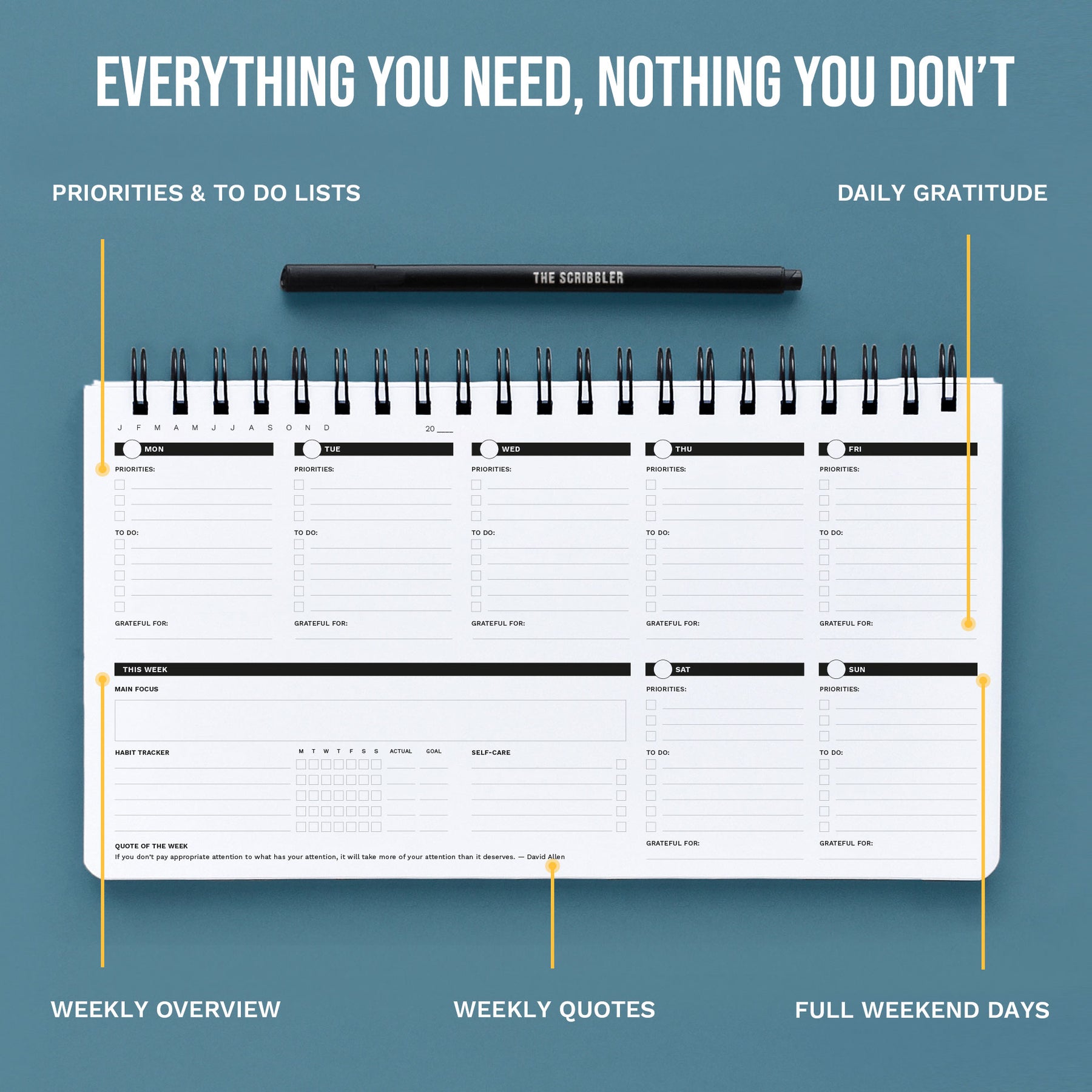 The Productive Weeks Version 2 is a calm, structured weekly planner designed to help you focus on what matters. Everything you need for a clearer, more intentional week, nothing you don’t.